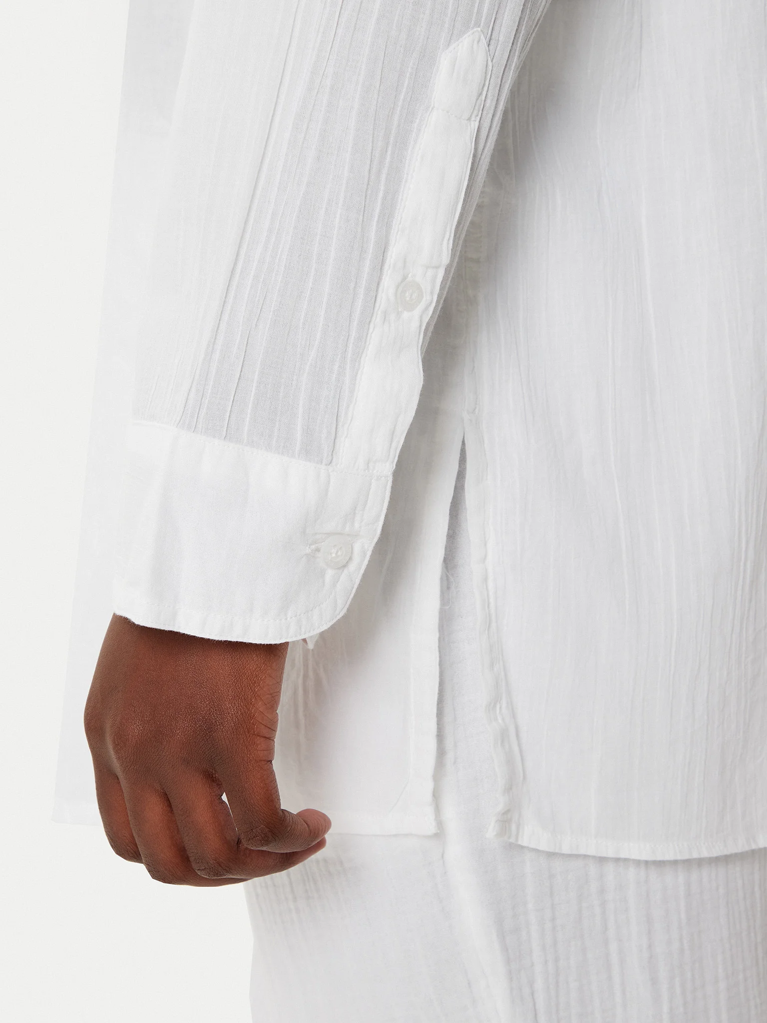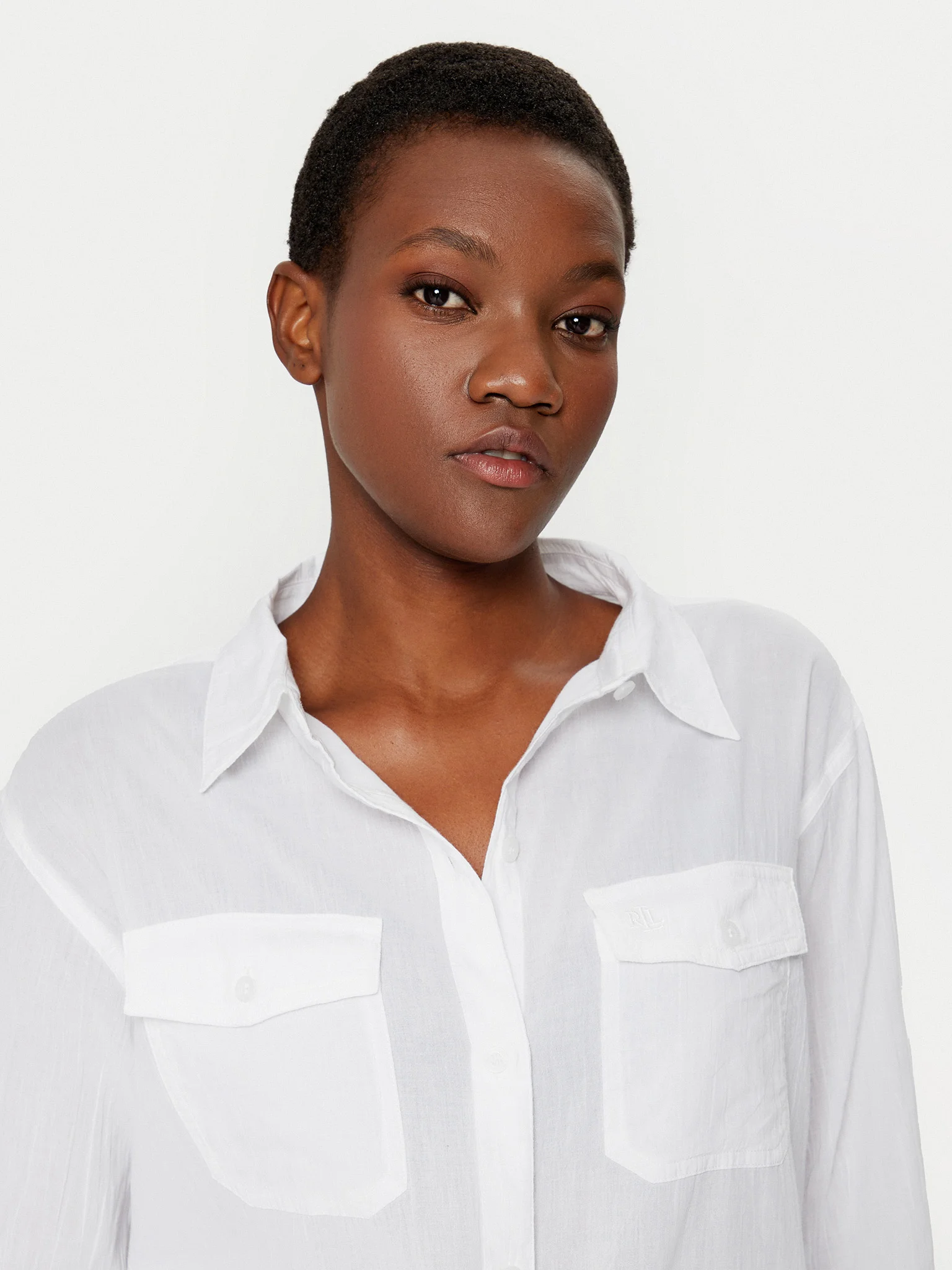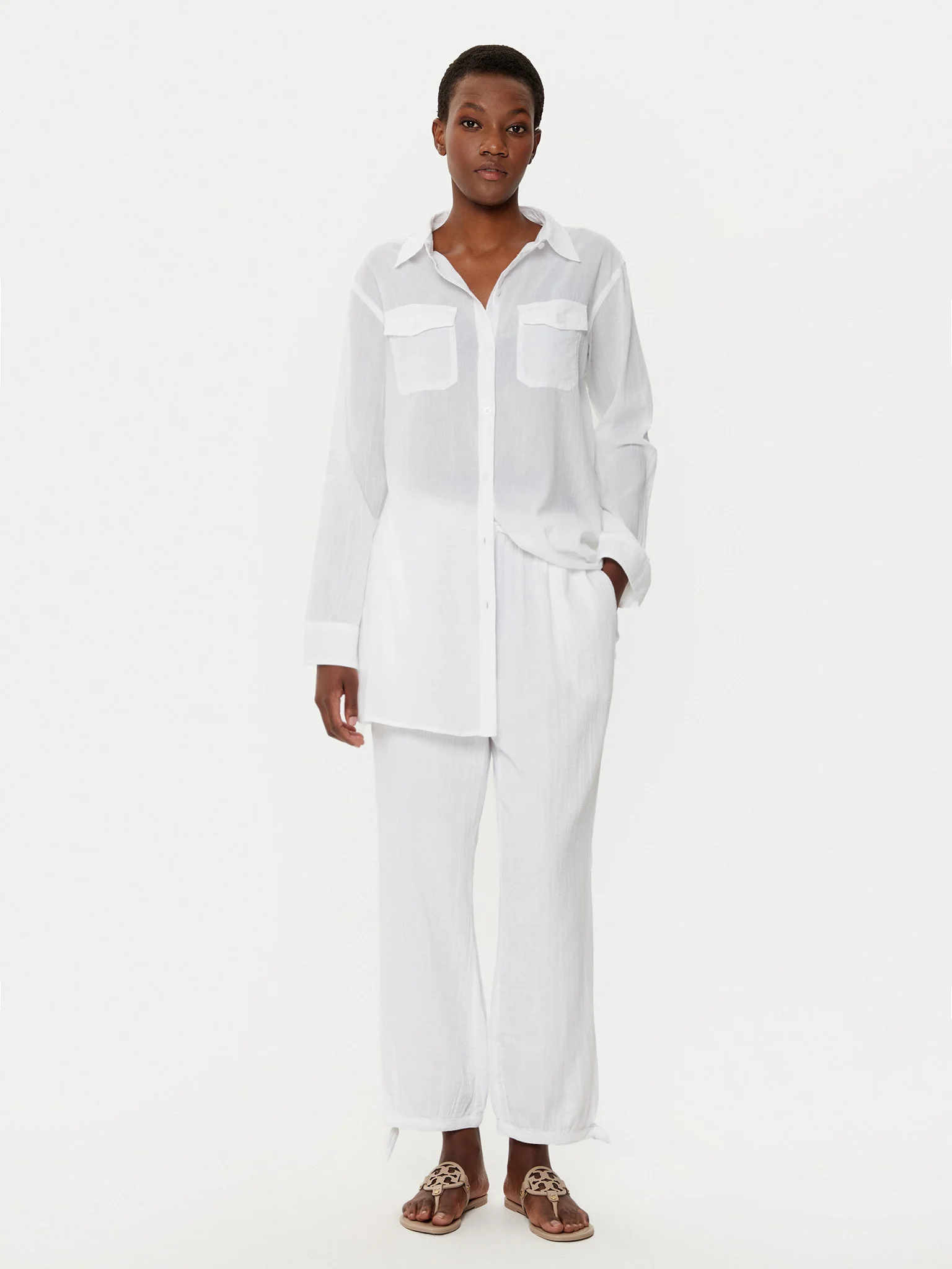 Dieses weiße Hemd wirkt leicht, modern und entspannt. Der klassische Kragen, die aufgesetzten Brusttaschen und der lockere Schnitt verleihen ihm eine stilvolle Lässigkeit. Seitliche Schlitze und die feine Optik machen es zu einem luftigen Teil für sommerliche Outfits.