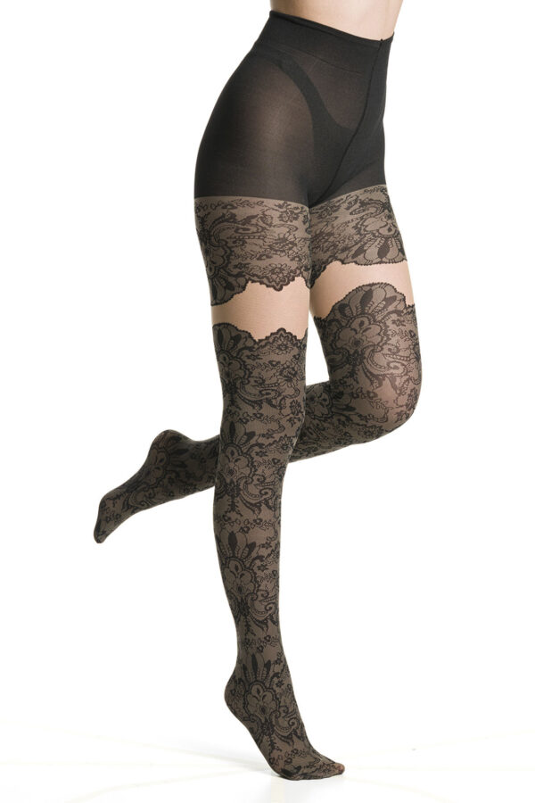 Sinnliche Strumpfhose mit nachgemachtem Spitzen-Design wie bei Halterstrümpfen und einem Push-up-Slip. Mit bequemem Bund, flachen Vier-Nadel-Naht und unsichtbarer Spitze am Fußabschluss für perfekten Tragekomfort.
