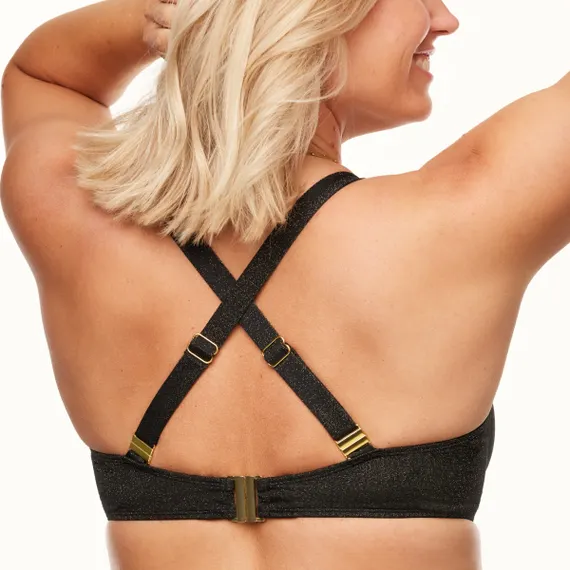 Dieses schwarze Bikini-Oberteil ist aus weichem Stoff gefertigt, der mit einem goldenen Lurexfaden dezent schimmert. Die festen, vorgeformten Cups stützen die Brust zuverlässig und zentrieren sie sanft in der Mitte – für eine schöne, klare Silhouette. Die Träger sind verstellbar und können gerade oder gekreuzt getragen werden, je nachdem, was dir am besten passt.