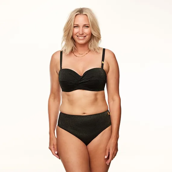 Diese schwarze Bikinihose besteht aus einem weichen Stoff, der mit einem goldenen Lurexfaden edel schimmert. Vorne sorgt ein Power-Mesh-Futter für einen subtilen Straffungseffekt, während die Rückseite geschmeidig bleibt und sich natürlich an deine Kurven anschmiegt. Der hohe Schnitt bedeckt sanft einen Teil des Bauches, betont die Taille und zaubert eine wunderschöne Silhouette.
