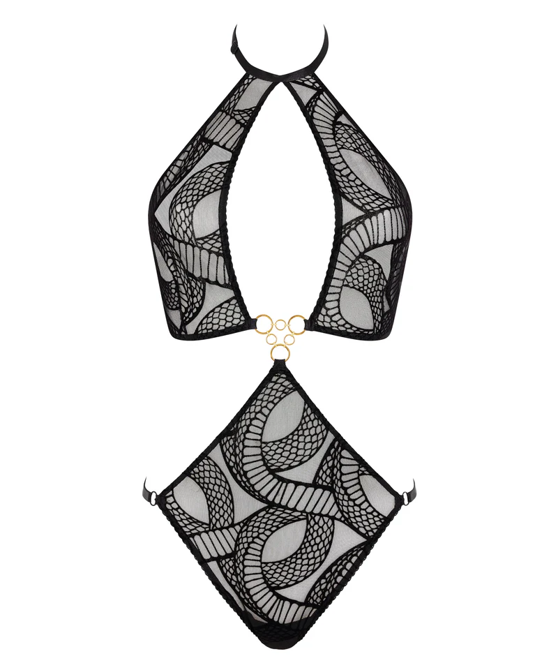 Dieser sinnliche Spitzenbody setzt dich perfekt in Szene: grafische Spitze trifft auf einen tiefen Ausschnitt mit Halterneck-Detail und eleganten Cut-outs. Der goldfarbene Ring-Akzent vorn sorgt für das besondere Highlight, während die weichen, elastischen Materialien angenehm auf der Haut liegen. Ein Statement-Piece für besondere Momente – modern, sexy und aufregend.